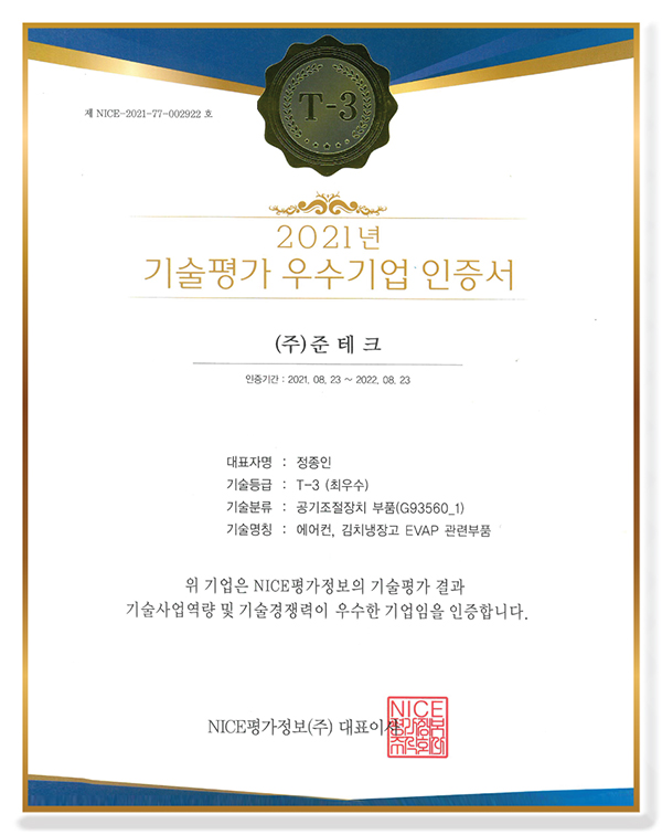 기술평가 우수기업 인증서